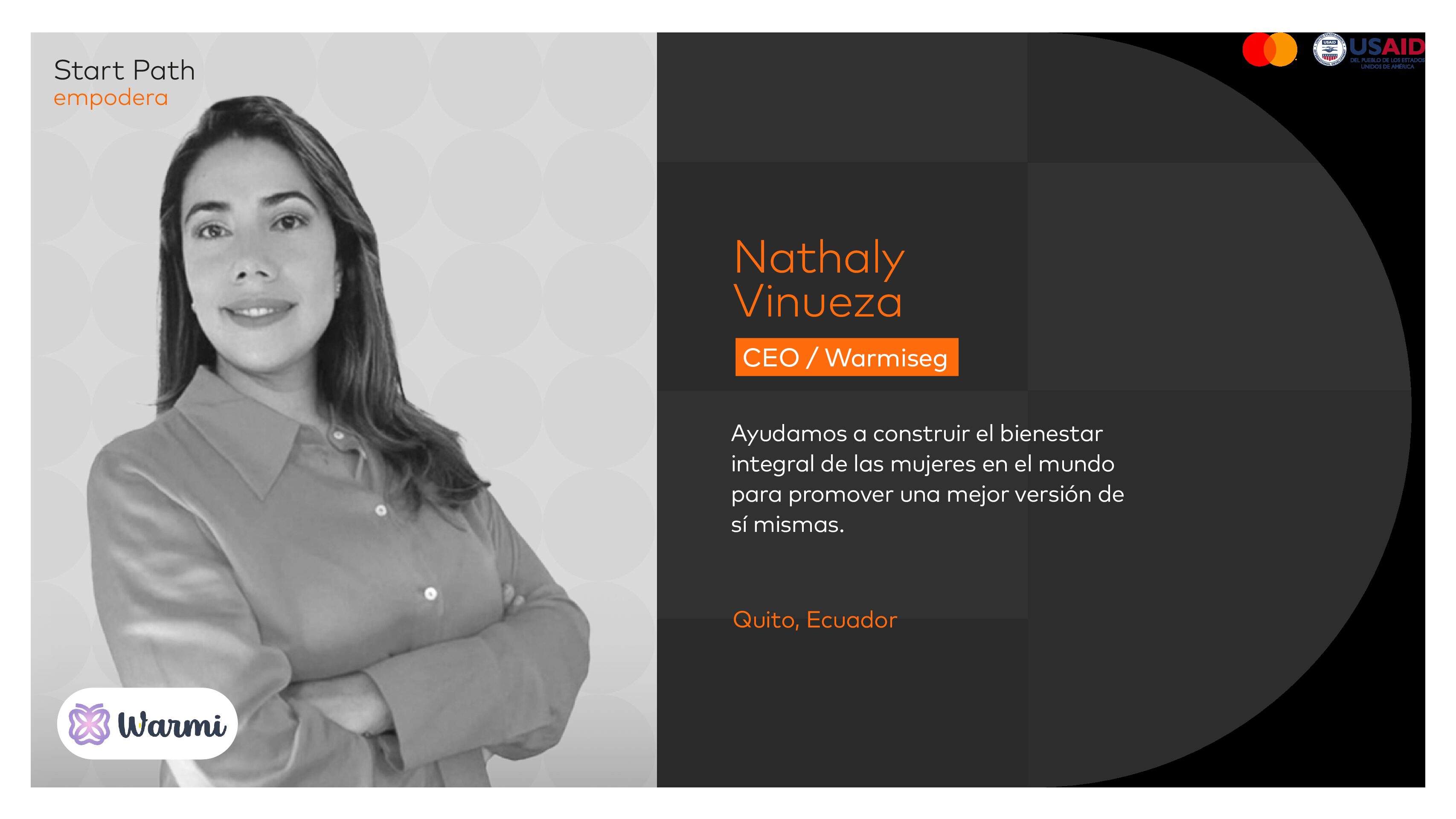 Nathaly Vinueza – CEO de Warmiseg, también de Ecuador, fue otra de las premiadas. Lo logró a través de la implementación de Femtech, una herramienta que utiliza la inteligencia artificial con el fin de ayudar a construir el bienestar integral de las mujeres en el mundo, para promover una mejor versión de sí mismas. Su propósito es disminuir la inequidad y la violencia de género a través del empoderamiento.
