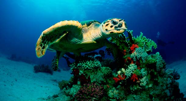 Calificada como en «peligro crítico», esta especie de tortuga vive en el arrecife Mesoamericano, la Costa del Este de África y el Triángulo de Coral. Las tortugas carey ayudan a mantener la salud de los arrecifes de coral. A medida que eliminan presas como las esponjas de la superficie del arrecife, proporcionan un mejor acceso para que los peces entren a alimentarse.