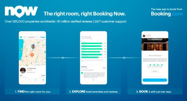 (Global).- Booking.com ha lanzado una nueva aplicación denominada Booking Now, de descarga gratuita, que permite realizar reservas hasta 48 horas antes del viaje, con el objetivo de facilitar al usuario las reservas de última hora, informó el portal. La ‘app’ Booking Now, basándose en el ‘big data’, sugiere distintos hoteles y alojamientos dependiendo de las pautas de comportamiento y preferencias del cliente, con un portafolio de más de 580.000 opciones.