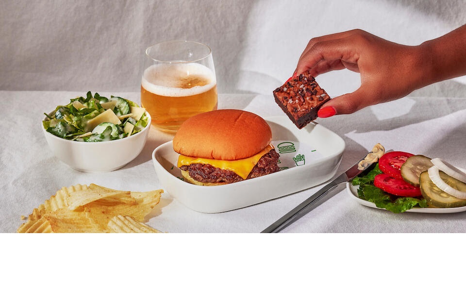 Ya sea la primera vez que usted prueba una hamburguesa de Shake Shack o que sea un cliente habitual, disfrutará de ingredientes de primera calidad en cada bocado. La hamburguesa de queso Shake Shack incluye una hamburguesa de carne Angus 100 por ciento, cubierta con queso y servida en un pan de papa tostado. Puede personalizar su comida con los ingredientes de la clásica ShackBurger: tomate, lechuga y la famosa ShackSauce de Shake Shack, servidos aparte. El platillo también incluye papas fritas, ensalada César y un brownie de chocolate oscuro inspirado en los sabores de Shack Attack, uno de los postres más populares de la marca.