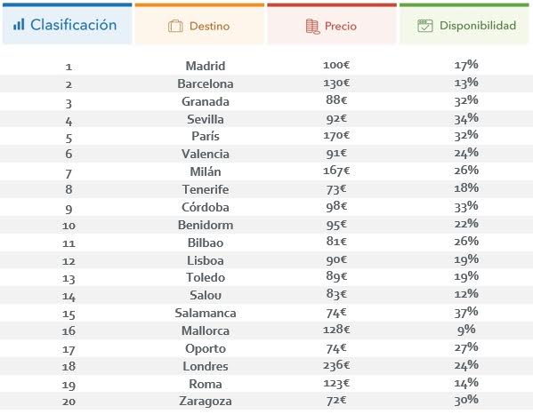 Los destinos se reparten por toda la geografía española, pero entre las primeras diez posiciones destacan ciudades andaluzas como Granada, Sevilla y Córdoba. El ranking lo dominan destinos urbanos, tanto españoles como europeos, aunque también destacan ciudades de interior como Toledo y Salamanca y destinos de playa como Tenerife, Salou o Mallorca.