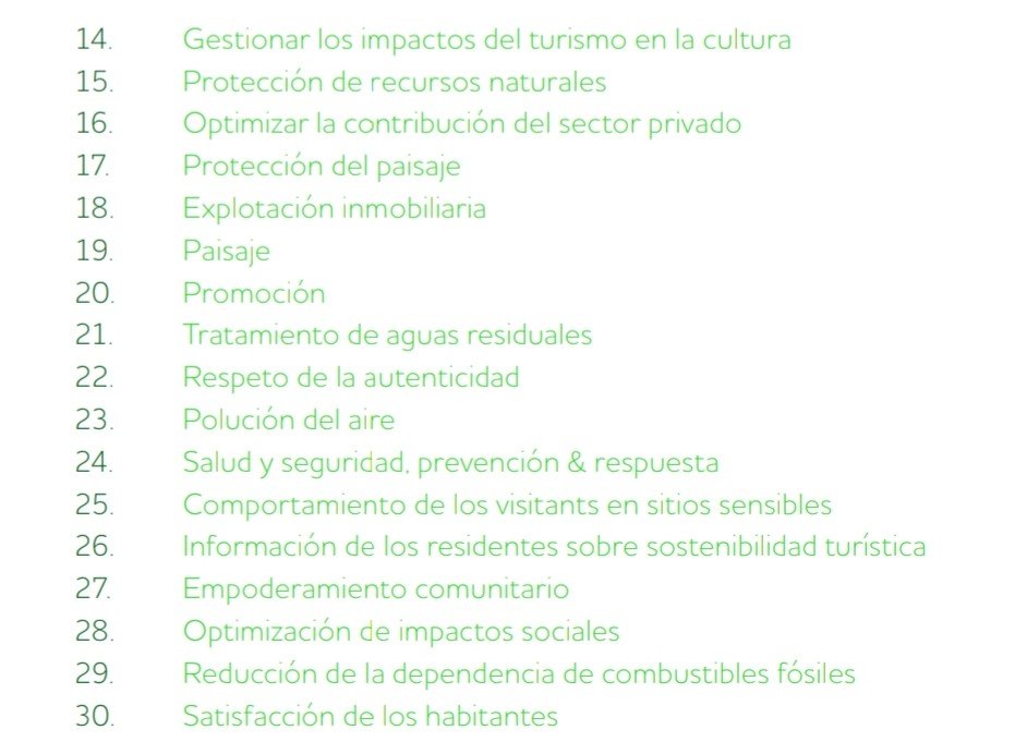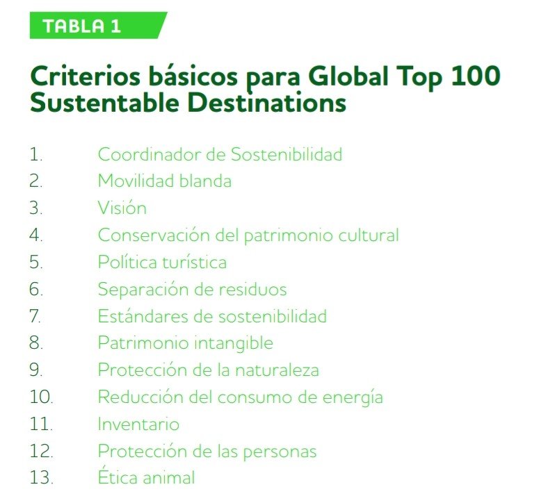 Existe una lista de los considerados 100 mejores destinos turísticos sostenibles elaborada anualmente por Green Destinations. El ranking Global Top 100 Sustentable Destinations trata de fomentar estas dinámicas y celebra los esfuerzos de los destinos orientados a la responsabilidad y el turismo sostenible en las que se incluyen iniciativas vinculadas al ecoturismo y el turismo de naturaleza. Los destinos nominados deben proporcionar información detallada, como destino y por parte de sus agentes principales, sobre sus estrategias de sostenibilidad que integren la perspectiva de los visitantes, de las poblaciones locales y la mundial. Para ello deben justificar el cumplimiento del estándar de los 30 criterios básicos establecidos por la organización (Tabla 1).