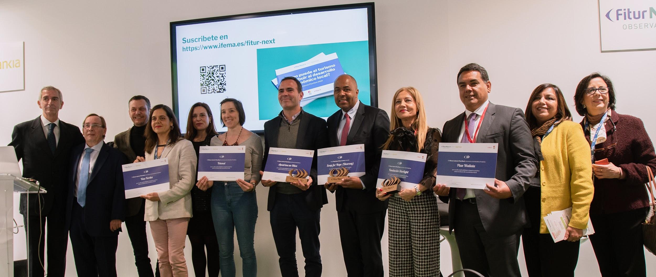 Madrid, 22 de enero. El Observatorio FITURNEXT, la plataforma de FITUR dedicada a promover buenas prácticas turísticas con el patrocinio de Bankia, ha entregado los premios a las iniciativas ganadoras del Reto FITURNEXT 2020: ¿Cómo puede el turismo contribuir al desarrollo económico local? en su acto inaugural. Por su alta replicabilidad e impacto positivo sobre la contribución al desarrollo económico local, Apadrina un Olivo obtuvo el primer lugar, seguido de la Fundación Starlight y Soap for Hope (Diversey).