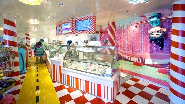 The Disney Dream just recently came out of a drydock refurbishment, and a number of new features were added that are worth checking out. Kids, and even adults during open house hours will want to explore the Star Wars and Disney Infinity additions to Disney’s Oceaneer Club, and families should scope out the Bibbidi Bobbidi Boutique makeover experience, the Funnel Puddle splash pool and the Midship Detective Agency scavenger hunt now featuring the Muppets. Adults will get to enjoy the Satellite Falls and Senses Juice Bar plus enhancements to The District. And lastly, all ages are sure to enjoy Vanellope’s Sweets & Treats (pictured in the header) for premium ice creams, sundaes and candies well worth the nominal fee.