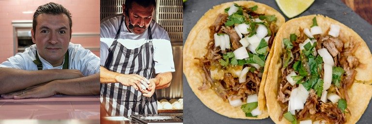 Javier Brichetto presenta su nueva tapa. Derecha, tacos de suadero de res de Tierra Mexicana. EFT.