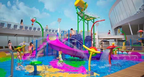 El parque acuático Splashaway Bay será una vibrante escapada acuática para pequeños y mayores, quienes disfrutarán de cañones de agua, toboganes, un gigantesco cubo y un gimnasio multiplataforma inspirado en la jungla que mantendrá a todos entretenidos durante horas. Pasajeros de todas las edades tendrán una emocionante aventura con el Ultimate Abyss, un tobogán con una caída de 10 pisos que realiza un recorrido desde la zona de piscinas y deportes hasta el Boardwalk , así como también con los tres toboganes que integran The perfect Storm: Cyclone, Typhoon y Supercell. (Fuente: crucero10.com)