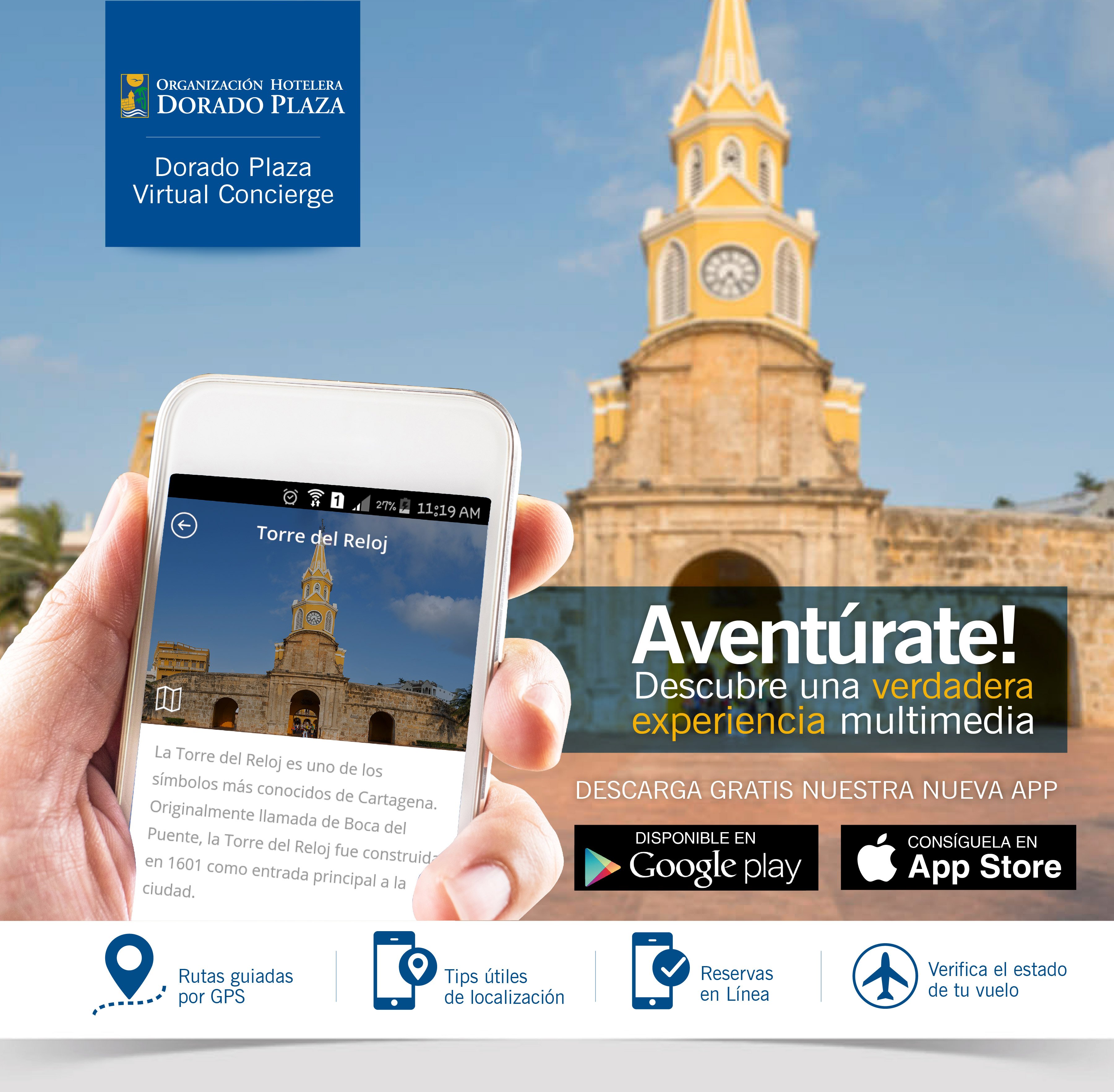 Dorado Plaza Virtual Concierge es la nueva herramienta multimedia para aquellos que por negocio o por placer visitan Cartagena de Indias o Bogotá y desean aventurarse en los rincones de estos dos mágicos destinos, invitándolos a recorrerlos mediante un sistema de rutas guiadas por GPS con puntos de interés e información sobre sus atractivos turísticos.