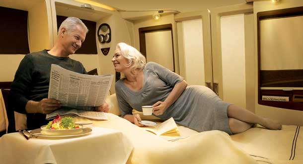 Singapore Airlines ocupa siempre los primeros puestos en los rankings de mejores compañías aéreas, su primera clase es algo espectacular llena de servicios totalmente exclusivos para sus clientes, entre ellos hay que destacar Las Suites, solo disponibles a bordo del A380, unas cabinas privadas con puertas correderas y persianas que permiten a solo unos pocos afortunados disfrutar de un mundo de lujo en el cielo. El interior ha sido creado por el diseñador francés de yates de lujo Jean-Jacques Coste, allí uno podrá sentarse en un sillón de cuero cosido a mano por el maestro artesano italiano Poltrona Frau y escuchar música con unos auriculares Bose, ver la tele en una pantalla LCD de 23 pulgadas, (la más grande en un avión) o tumbarse en una cama doble independiente con sábanas, mantas, almohadas, zapatillas y pijama Givenchy.En el baño le espera un neceser de Salvatore Farragamo con todo lo que puede necesitar, incluida colonia.