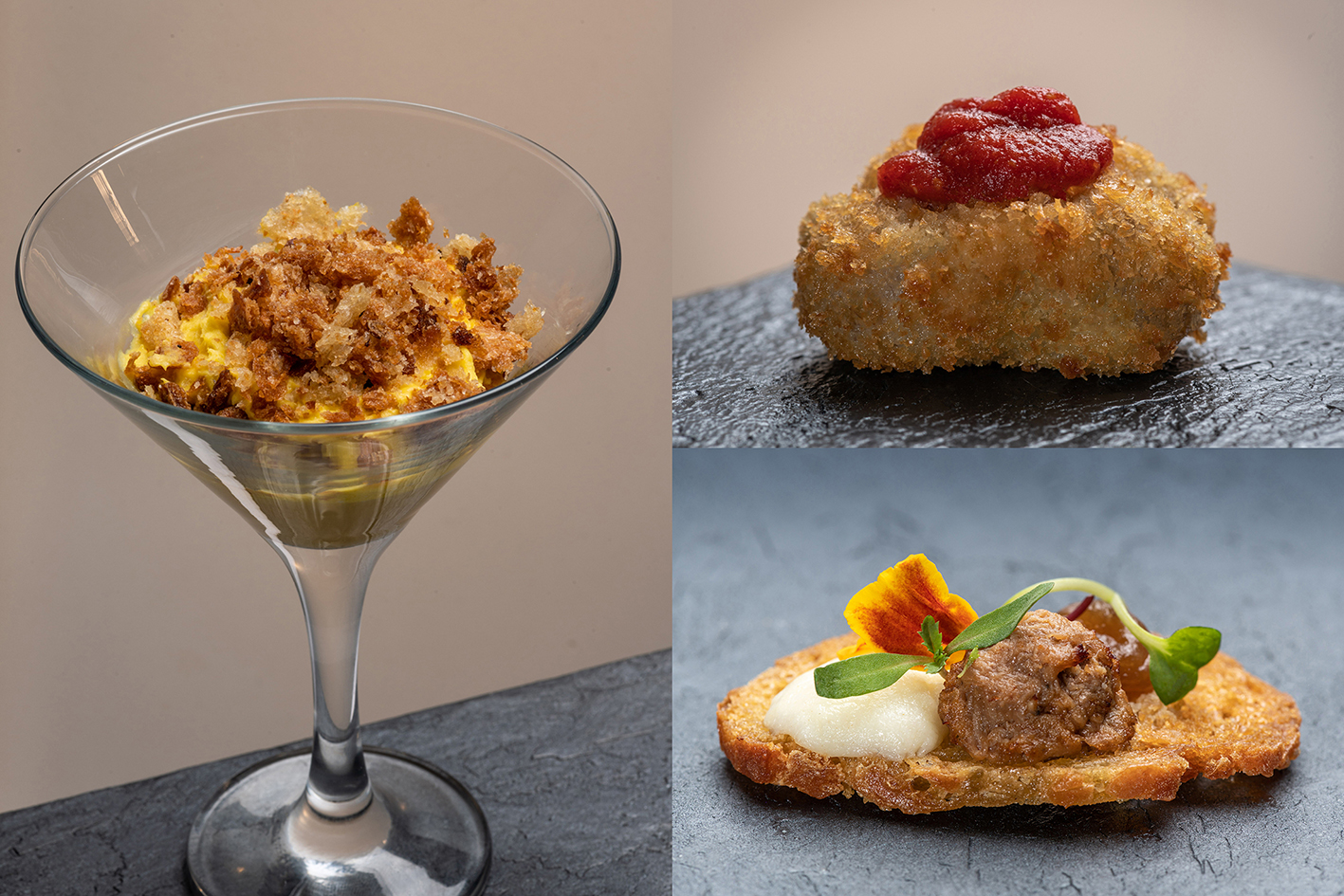 Fiel a su fama de transgresora desde el respeto a la tradición, Rebeca Hernández reinventa la croqueta en cinco sorprendentes versiones: dos de inspiración asiática, una ecológica y otras dos de raíz española. Así, de su pasión por la comida callejera oriental deviene una croqueta en crujiente rollito de primavera o neem de txangurro con toques cítricos. Su nigiri-croqueta aprovecha la grasa del jamón ibérico para aromatizar la clásica mojama de atún, toda una fusión de mar y montaña con envoltorio japonés.