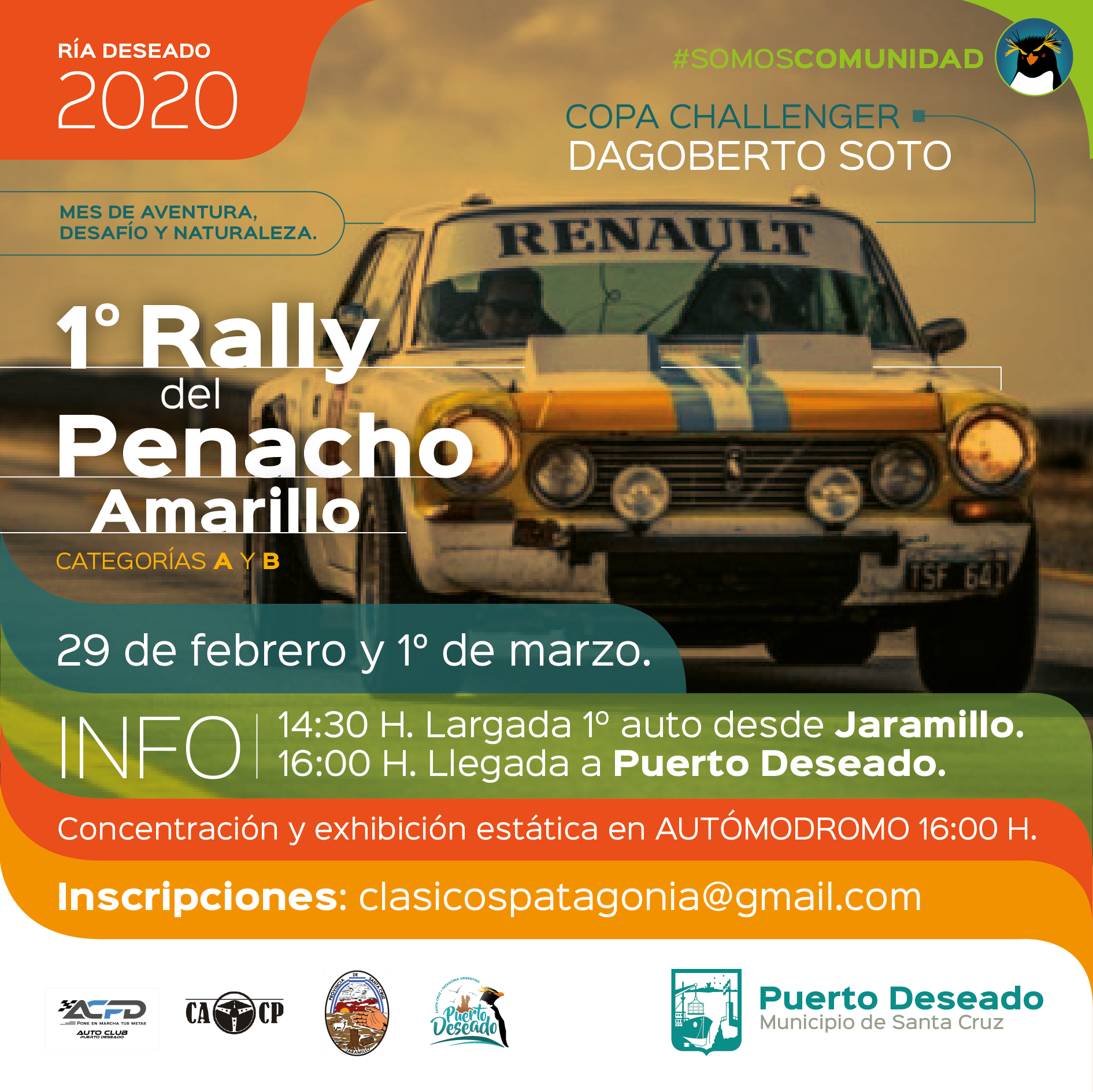 Por último el domingo 29 de febrero y domingo 1° de marzo se realizará el 1° “Rally del Penacho amarillo” organizado por el Club de Autos Clásicos de la Patagonia” y la Subsecretaría Municipal de Turismo de Puerto Deseado, junto al Auto Club Puerto Deseado. La partida será desde Jaramillo donde los aventureros conductores serán agasajados con un refrigerio. La caravana integrada por mas de 30 autos antiguos y clasicos, partirá de Jaramillo a las 14,30 hs estando programada la llegada a Puerto Deseado a las 16 hs. La concentración y muestra estática será en el autódromo local Ramonín Fernandez. Inscripciones clásicospatagonia@gmail.com.