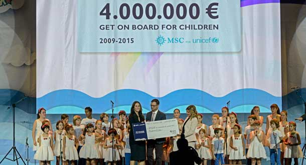 (Global).- MSC Cruceros S.A., la mayor compañía de cruceros de capitales privados a nivel mundial, líder en Europa, Sudamérica y Sudáfrica, anunció que hasta la fecha se recaudaron 4 millones de euros, a bordo de sus barcos alrededor del mundo, en el marco de su alianza con UNICEF. En una ceremonia que tuvo lugar ayer en la Expo Milano 2015, con la presencia de ejecutivos de UNICEF y MSC Cruceros, cientos de niños y visitantes de la exposición de todo el mundo, Daniela Picco, Directora de Alianzas Estratégicas de MSC Cruceros, entregó en mano un cheque simbólico por 4 millones a Phillippe Baud, Director Adjunto de UNICEF en Suiza.