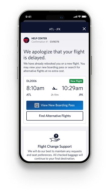 La aplicación actualizada aporta simplicidad a lo inesperado con una vista del Centro de Ayuda. Durante los momentos en que se interrumpa el viaje en vuelos de Delta, los clientes recibirán una vista simplificada de las acciones necesarias para continuar su viaje.