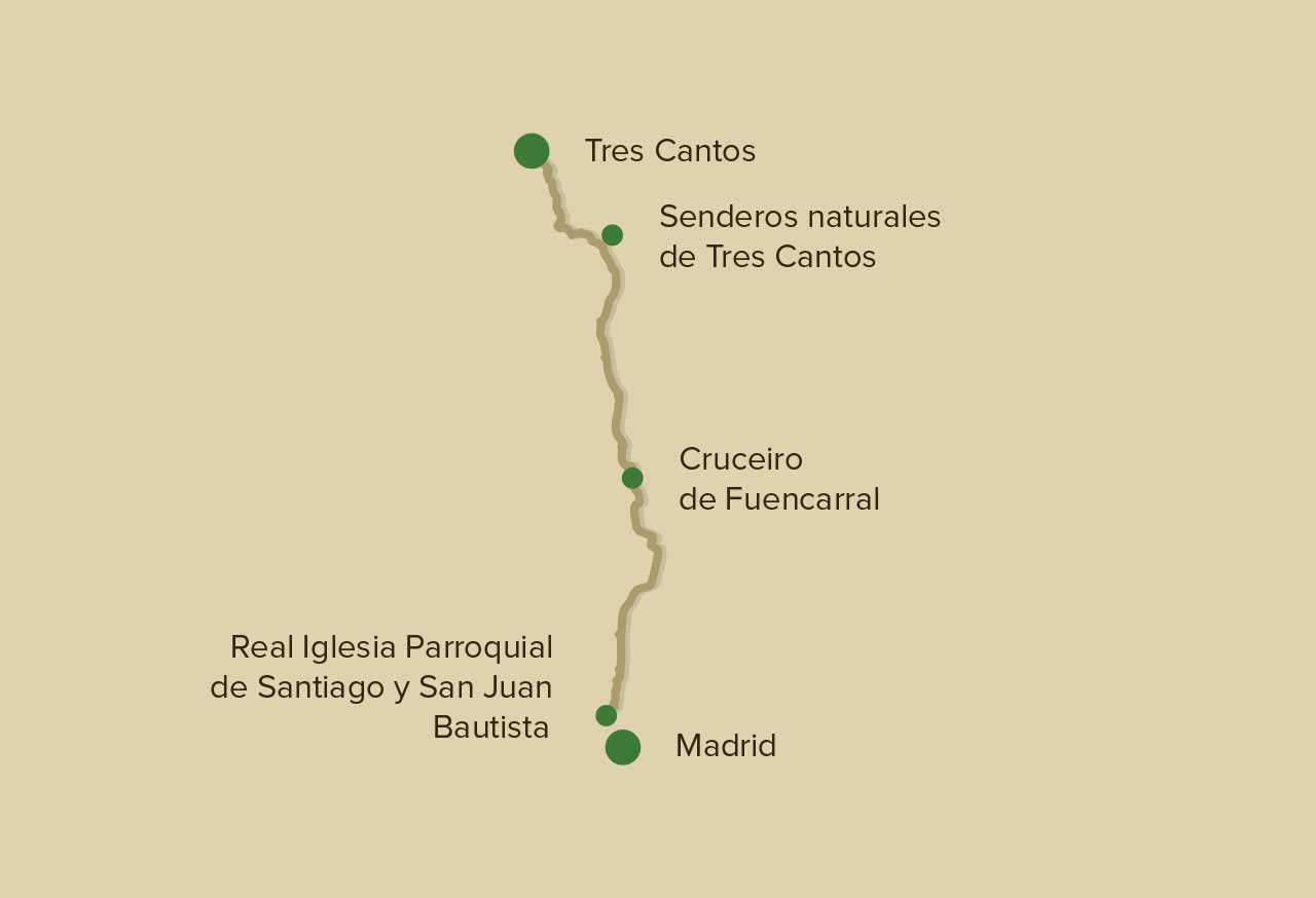 Emprender el Camino de Santiago desde el mismo centro de la capital es posible. El kilómetro cero del Camino de Madrid se encuentra en la Real Iglesia Parroquial de Santiago y San Juan Bautista donde el peregrino encuentra el primer cruceiro y, en la Asociación de Amigos del Camino de Santiago de Madrid puede sellar su credencial. Atravesando el centro, saliendo por Plaza Castilla, el peregrino llega al barrio de Fuencarral donde encontrará un segundo cruceiro, una vieira y la inscripción “A Santiago de Compostela 665 km”. El Camino le llevará hacia la moderna Tres Cantos dejando atrás el skyline de Madrid presidido por sus cinco torres. Una primera etapa tranquila, sin mucha dificultad.