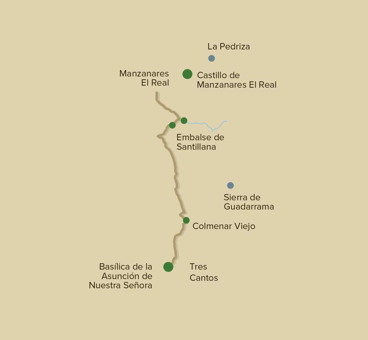 El rico patrimonio cultural y natural inunda esta segunda etapa de 25 kilómetros con puntos clave en toda ella. Al abrigo de la Sierra de Guadarrama, el peregrino llega a Colmenar Viejo donde la imponente Basílica de la Asunción de Nuestra Señora del siglo XV le recibe. El Camino continúa por un entorno natural único que le lleva a cruzar el Embalse de Santillana para llegar a Manzanares El Real y sellar la credencial.