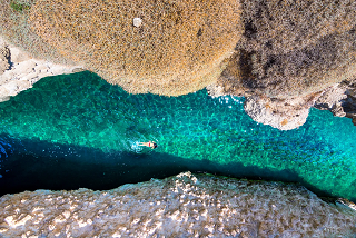 ¿Qué tendrán las islas griegas que nos enamoran con cada una de sus instantáneas? Aunque a todos nos suenen los molinos de Mikonos o los atardeceres de Santorini, en Grecia todavía quedan lugares secretos y uno de ellos es la playa de Papafragas, una de las más hermosas de todas las Cícladas.Vista desde lo alto, Papafragas parece una gran piscina natural excavada en los acantilados. De hecho, si quieres disfrutar de la playa, es recomendable acudir temprano ya que cuando sube la marea, la zona de arena, ya pequeña de por sí, queda bastante reducida. Se puede acceder caminando por los acantilados y bajar por las escaleras excavadas en la roca, por lo que nos es apta para niños o personas mayores y con movilidad reducida. También puedes llegar por mar pero entonces, te perderas la hermosa vista desde lo alto del acantilado.
