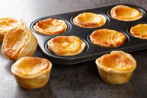 También conocidos como pastéis de nata, estos deliciosos pastelitos de hojaldre rellenos de una suave crema pastelera se hornean a la perfección y su receta original se remonta al siglo XIX en el Monasterio de los Jerónimos en Belém.