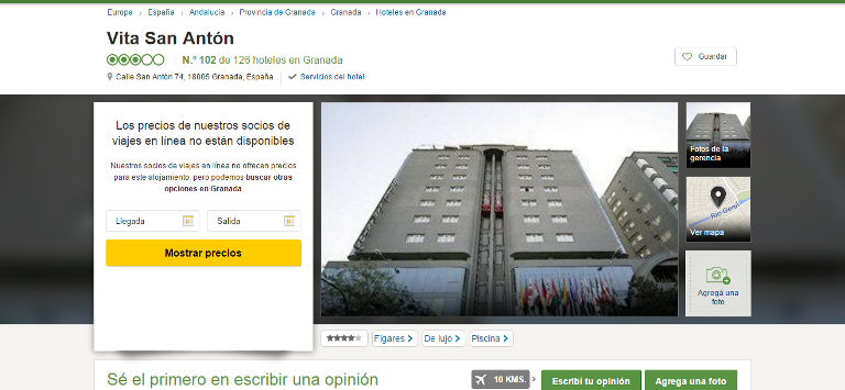 Nuevo y delirante capítulo de TripAdvisor. Después del caso del hotel ‘fantasma’ de República Dominicana, el polémico portal cuenta entre sus páginas a otro establecimiento inexistente. Se trata del hotel Vita San Antón, en el centro de Granada, que según TripAdvisor está aún en marcha pese a que cerró sus puertas el 8 de diciembre de 2014, tras la decisión de la cadena Vita Hoteliers, dejando importantes deudas en nóminas e impagos a proveedores.