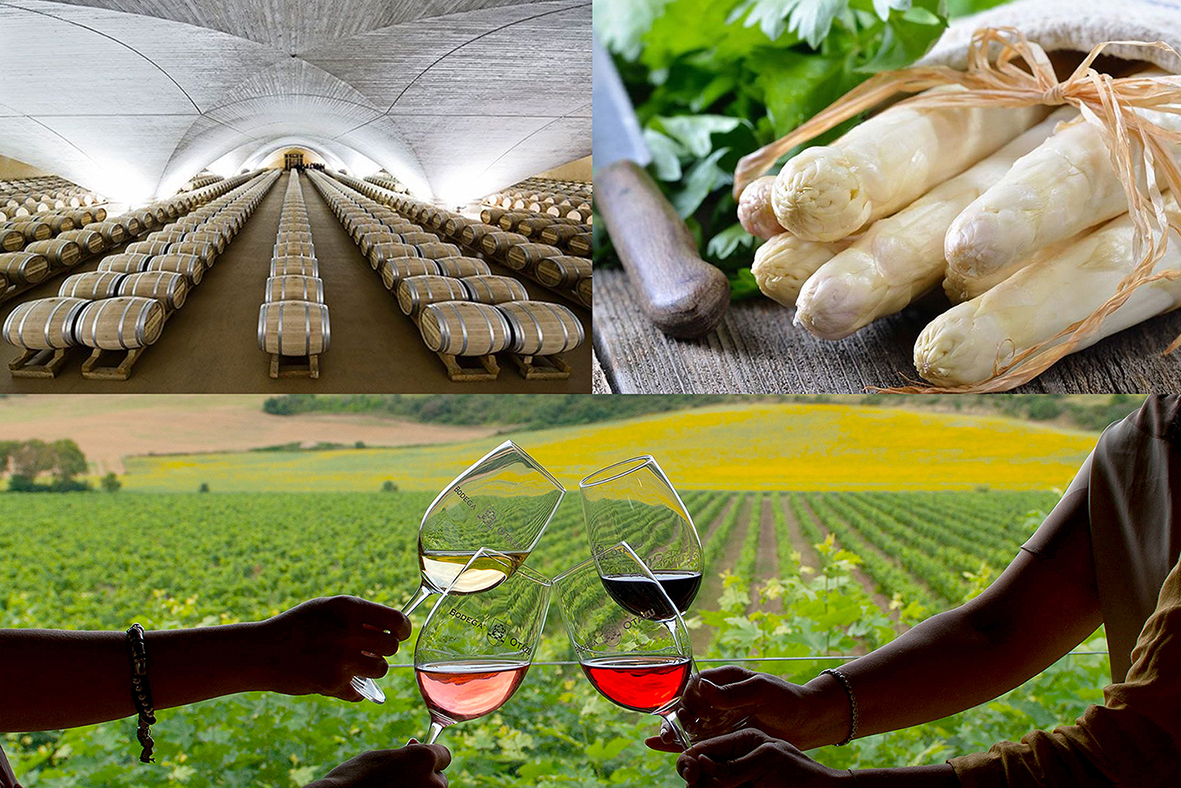 Algunas visitas técnicas de FoodTrex Spain 2021: arriba (izda.), Bodega Otazu, la ‘catedral del vino’. Abajo, sus vinos y viñedos. Arriba (dcha.), espárrago blanco de Uterga. MD.