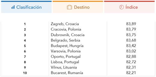 El ranking compara 50 de las grandes ciudades europeas más turísticas y en él se observan mayoritariamente destinos del este de Europa entre las primeras posiciones: muchos de ellos obtienen valoraciones que no descienden de los 80 puntos como Dubrovnik (83,75), Budapest (83,42) o Varsovia (83,02). Entre las 10 primeras ciudades destacan las dos portuguesas que logran una buena posición, Oporto con 82,88 puntos en el séptimo lugar y Lisboa con 82,72, en el octavo.