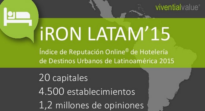 (España).- Así lo certifica la 3ª edición del “Índice de Reputación Online de los Hoteles de Destinos Urbanos de Latinoamérica, 2015” (iRON LATAM’15), realizado por la consultora Vivential Value en base al estudio de los alojamientos de 20 capitales de países latinoamericanos, de los que se han localizado más de 1,2 millones de opiniones en los principales portales turísticos de Internet.