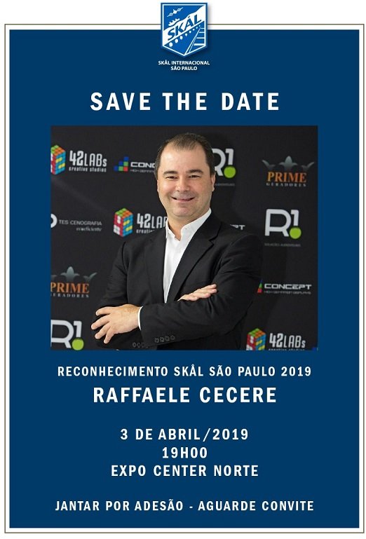 Um jantar por adesão, dia 3 de abri, às 19h00, promovido pelo Skål, é motivado pelo reconhecimento ao parceiro do Grupo R1, Raffaele Cecere. Será cobrada tarifa especial para associados das entidades parceiras, a saber, ADVB, Abracorp, Abav, ABEVT, Abih, Alagev, Braztoa, Fohb, SPCVB, Ubrafe e Unedestinos.